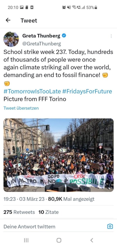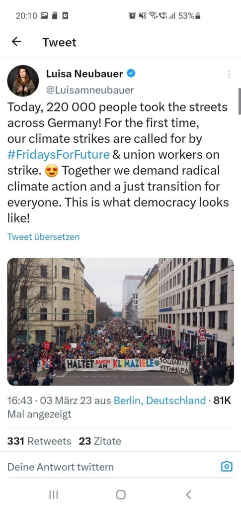 Auf Europäischer Ebene haben wir mit dem Green Deal schon viel erreicht, aber die Umsetzung fehlt noch. Zwei Drittel der Vorhaben sind noch nicht verabschiedet! Und im nächsten Jahr steht wieder eine Europawahl an und bevor alle Europaparlamentarier in den Wahlkampfmodus gehen, sollten die schon erreichten Vorhaben bis zum Jahresende beschlossen werden, denn nach der Europawahl 2024 könnte es sein, dass dieser Erfolg des Green Deals, keine Chance mehr auf eine Umsetzung hat. Die Kommission muss jetzt liefern! Ohne Fridays for Future, ohne die vielen Hunderttausenden gerade auch jungen Menschen auf den Straßen vor der Europawahl 2019, würde es diesen Europäischen Green Deal überhaupt nicht geben. Deswegen kommt der Globale Klimastreik an diesem Freitag, den 15.9.2023 genau zur richtigen Zeit. Wenn wieder viele Menschen auf die Straße gehen, ist das ein starkes Zeichen für die Verteidigung des Green Deals (in der EU und in seinen Mitgliedstaaten)! Also lasst uns alle der Politik zeigen, dass wir Taten sehen wollen! Es gibt keinen Planet B!