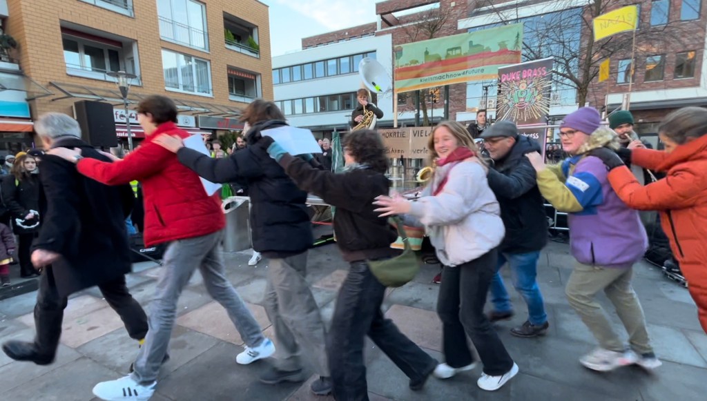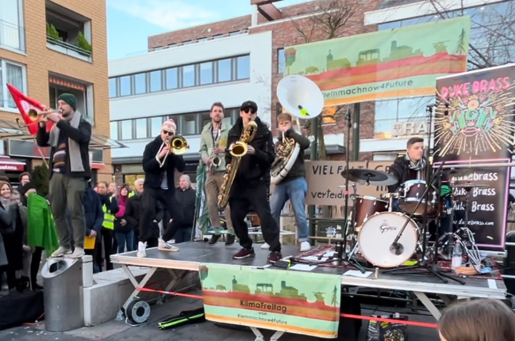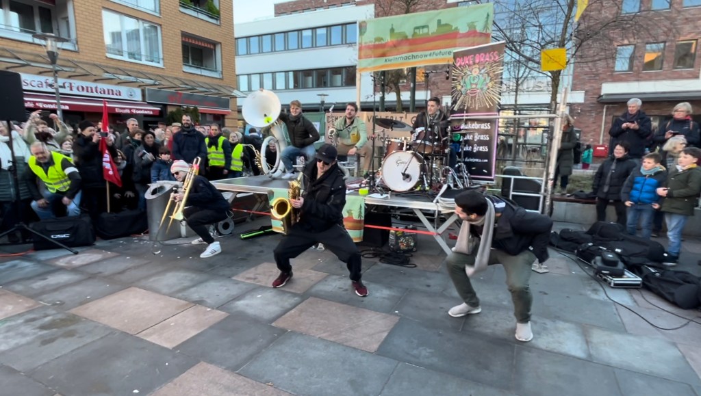 Für eine Auflockerung des Events sorgte zwischen den teils bewegenden Reden die Band Duke Brass, die den ganzen Rathausmarkt stimmungsvoll unterhielt, auch mit choreographischen Einlagen, um die Kälte zu vertreiben.