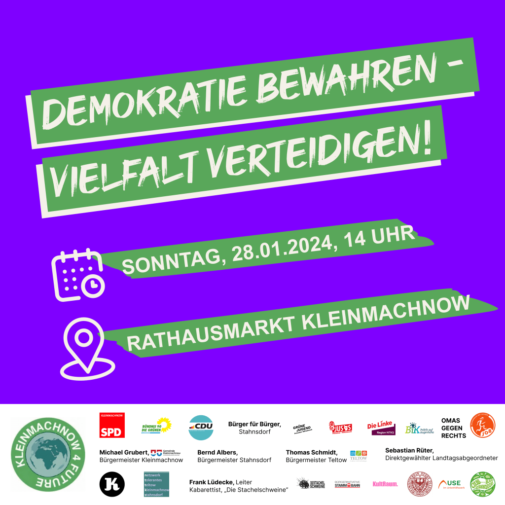 Jetzt sind auch wir in Teltow, Kleinmachnow und Stahnsdorf gefragt: Es ist unsere gemeinsame Verantwortung, als Zivilgesellschaft ein solidarisches Miteinander zu verteidigen. Wir sind entschlossen, laut und aktiv zu werden: für eine offene, demokratische, plurale und solidarische Gesellschaft, gemeinsam gegen den Rechtsruck in Deutschland und Europa! Schweigen ist keine Option! Wir müssen sichtbar und hörbar werden. Die Zeit zu handeln ist jetzt, denn bei den Kommunal-, Landtags- und Europawahlen in 2024 geht es um viel!