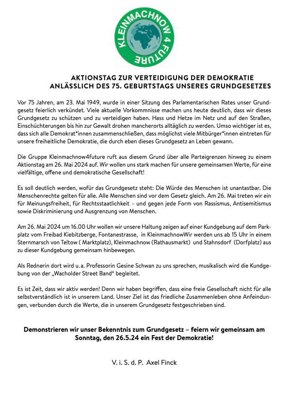 Am 26.05.2024 feierte TKS (Teltow, Kleinmachnow und Stahnsdorf) zu Ehren des Jubiläums des Geburtstags unseres Grundgesetzes mit einem Sternmarsch und einer anschließenden Kundgebung. Zu Gast als Rednerinnen für die anschließende Kundgebung geladen waren: Prof. Dr. Gesine Schwan, Verfassungsrichterin Frau Karen Sokoll und Franziska Merkel-Anger von den Omas gegen rechts.