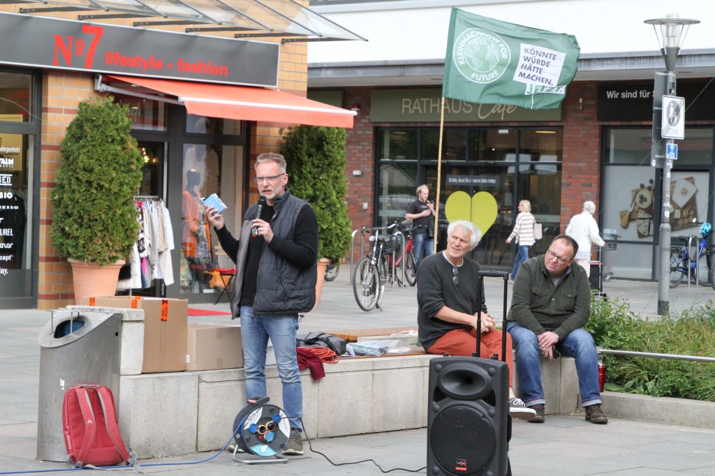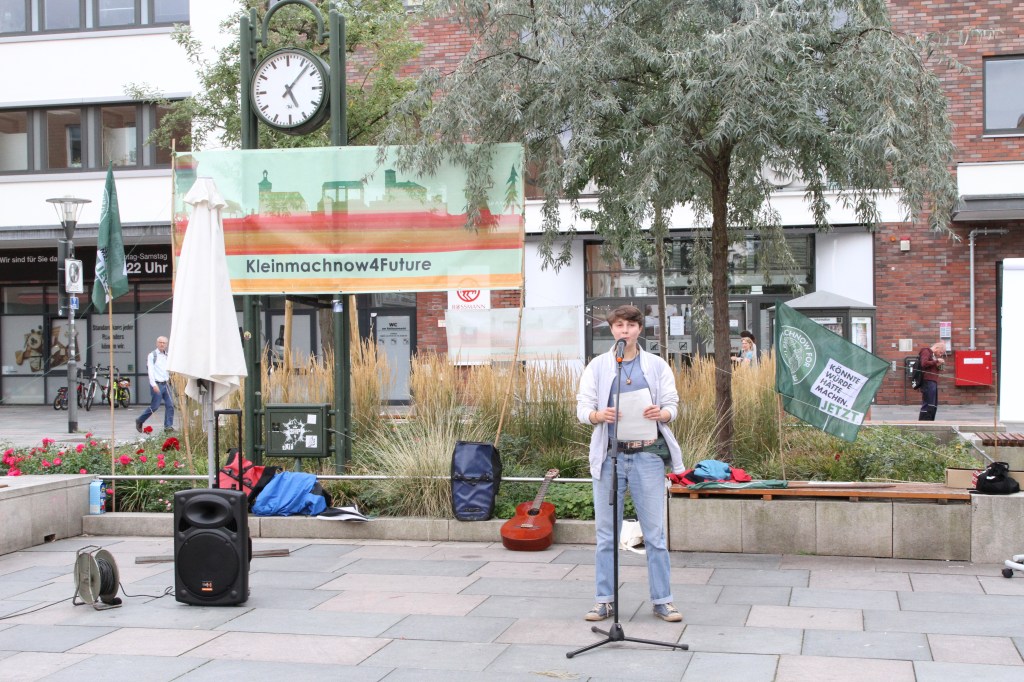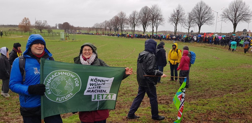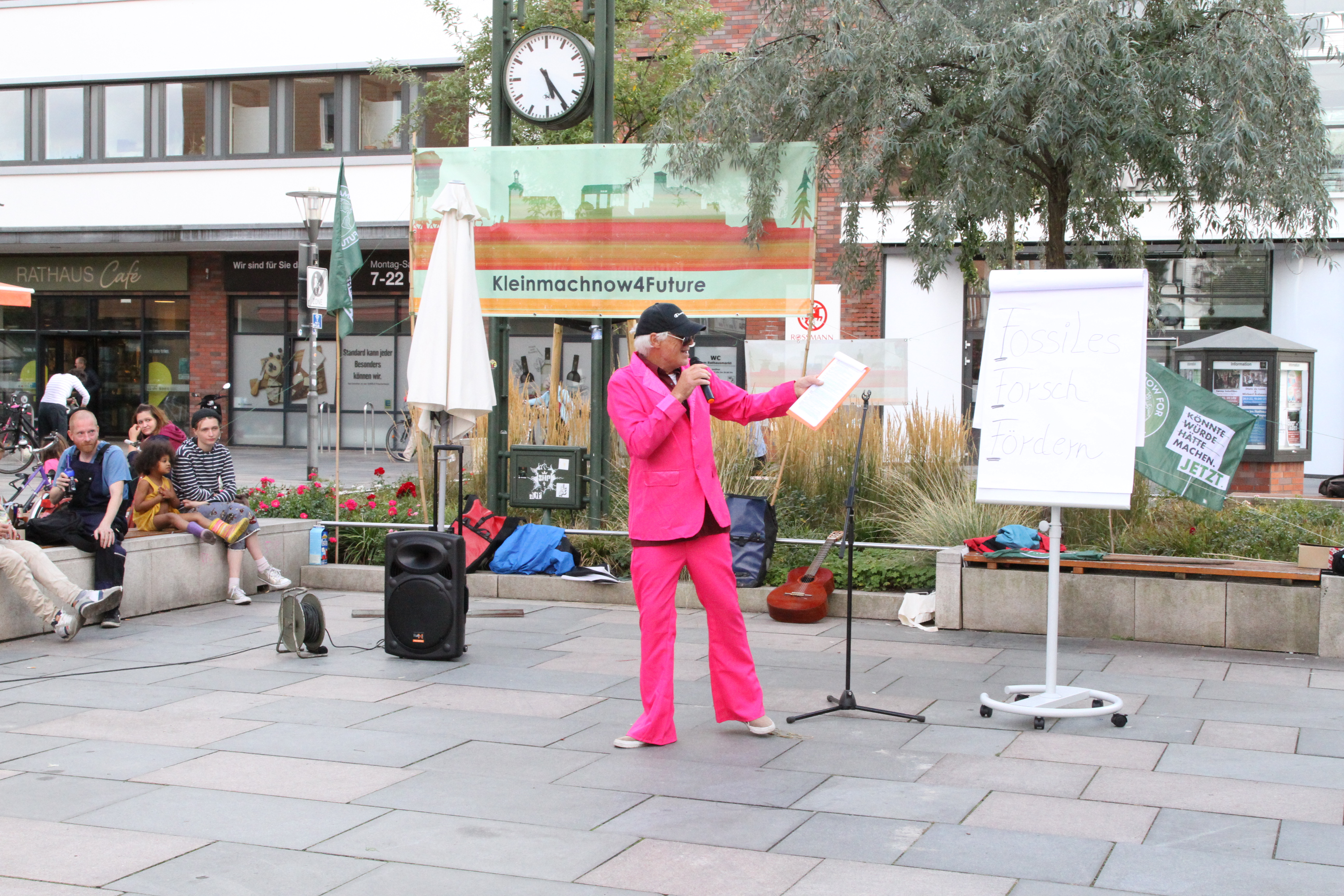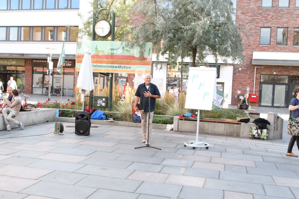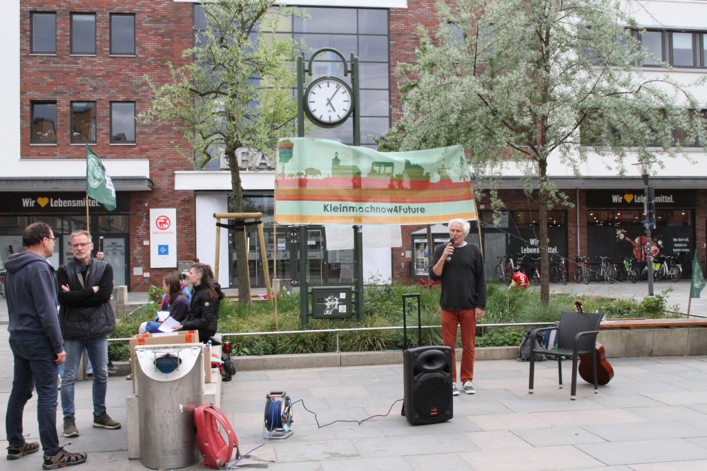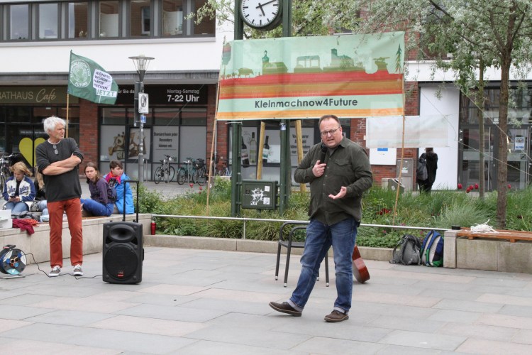 Man muss es leider sagen: Die Klimabewegung dümpelt im Moment! Die Teilnehmerzahlen gehen sehr nach unten und so auch an diesem Freitag. Die Gewerkschaft verdi war mit vielen Leuten anwesend – geschätzt 500 – und noch mal so viele von den Fridays. Und verdi dominierte mit Fahnen, Bühne, Ständen und Rednerbeiträgen die Demo. Schwere Zeiten für die Klimabewegung, weil andere Themen wie Ukraine-Krieg, Gaza-Krieg, Aufkommen des Rechtsextremismus so sehr im Vordergrund stehen. Dabei ist es ja nicht so, dass deswegen der Klimawandel einfach mal aufhört! Die Nachrichten sind immer wieder voll von neuen Entwicklungen in verschiedenen Bereichen, wo sich die abzeichnende Klimakatastrophe zeigt. 1,5 Grad – schon jetzt erreicht, auch wenn noch nicht im Jahresmittel. Aber es gibt keinen Anlass, sich jetzt zurückzuziehen und zu resignieren – wir von Kleimnachnow4future jedenfalls nicht.