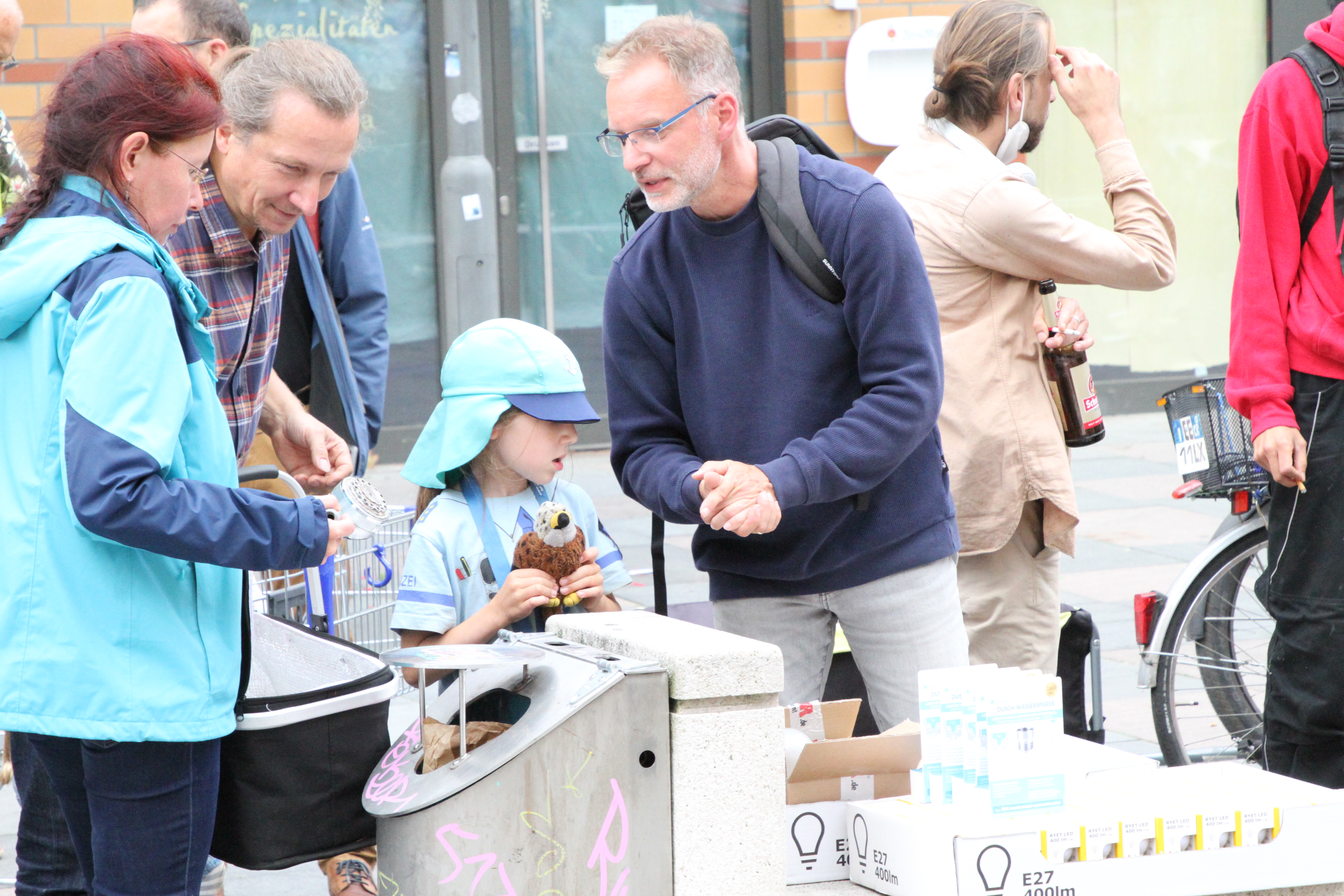 Was hat Kleinmachn4future mit dieser Messe zu tun? Ganz viel! Denn mit unserem veränderten Vorgehen – wir sind nicht mehr vor dem Rathaus, sondern im Rathaus – hatten wir uns vorgenommen, das Sanierungsproblem, vor allem in der Sommerfeldsiedlung anzugehen. Jede/r weiß es hier: Wegen der vielen eher kleinen Einfamilienhäuser geht die meiste Energie bei uns ins Heizen der Häuser. Da haben wir uns mit der Lokalen Agenda Klimaschutz der Gemeinde Kleinmachnow zusammengetan und mit Hilfe der für die Lokale Agenda zuständigen Mitarbeiterin Emily Reich den Plan einer Energie- und Sanierungsmesse entwickelt. Und durch die große Hilfe von Frau Reich – von Firmen und Experten anschreiben und verpflichten – und die Verwaltung, die jetzt mit im Boot saß mit der Entwicklung von Logos, Plakaten und verschickten Postkarten kam es dann zur Messe am 24.2.24 vormittags von 11-16 Uhr. Was war da los? Es kamen geschätzt 500 Interessierte, die sich bei verschiedenen Vorträgen und an den Ständen von Firmen informieren konnten, wie man sein Haus sanieren kann. Außerdem waren Bürger/innen anwesend, die schon eine solche Sanierung durchgeführt hatten und die über alles befragt werden konnten.